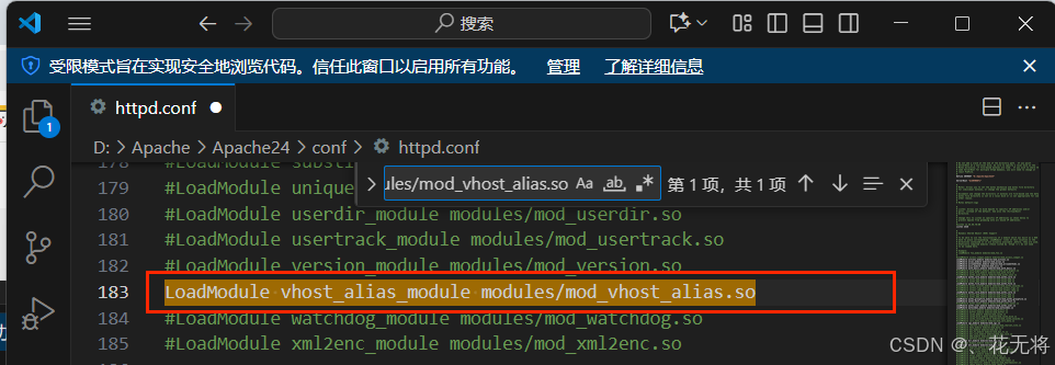 第三,查找 LoadModule vhost_alias_module modules/mod_vhost_alias.so,删除前面 # 号。