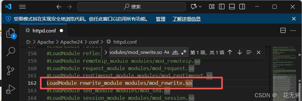 第二,查找 LoadModule rewrite_module modules/mod_rewrite.so,删除前面 # 号。