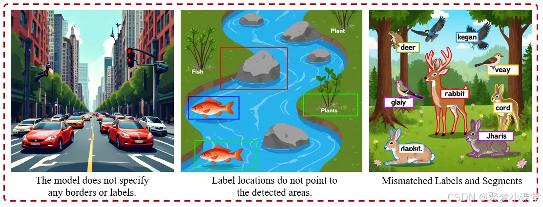 模型会标注错误标签、边界框位置错误,或无法将语义分割区域与目标区域对齐。