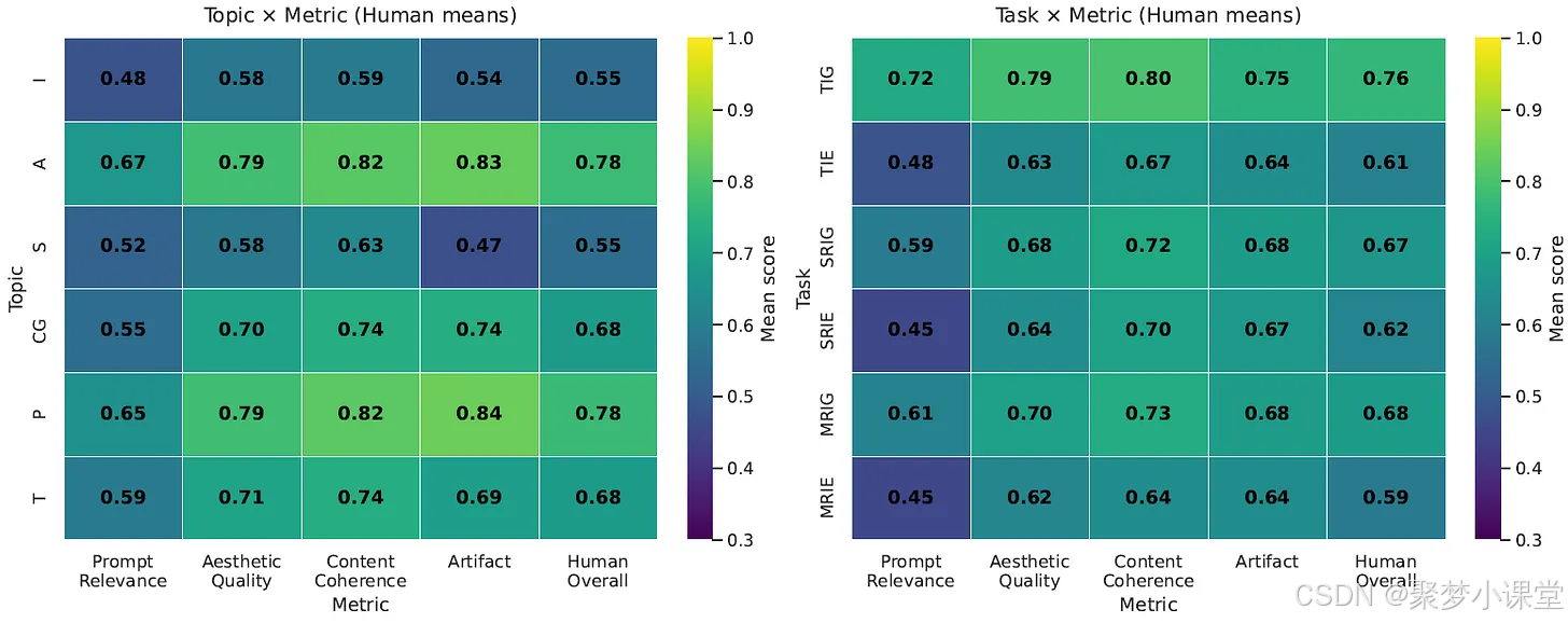 - 辅助评估:模型辅助验证引入基于视觉 - 语言模型(VLM)的自动评分器,其评分与人工评分的一致性(Kendall τ)约为 0.79,接近人类判断水平。但该模型无法识别细微瑕疵(如微小文字错位),因此最终仍以 "人工评估 + VLM 辅助" 作为可靠方案。