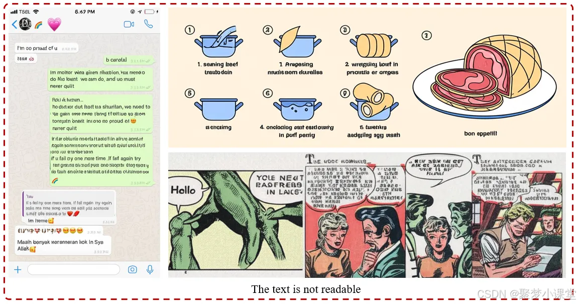 在截图、漫画或信息图表等文本密集场景中,模型表现常常不佳。生成的文字会出现混乱不清、错位或完全无法识别的情况。