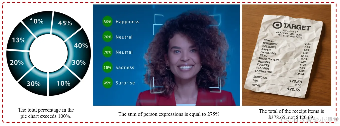 模型无法完成基础算术或比例推理。例如百分比超过 100%、求和结果与总数不符,或内部数值存在矛盾。