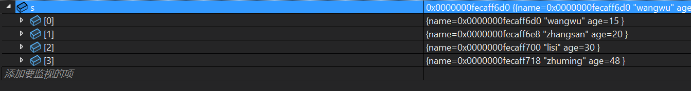 struct Stu s[] = { {"zhangsan", 20}, {"lisi", 30}, {"wangwu", 15} ,{"zhuming",48} };