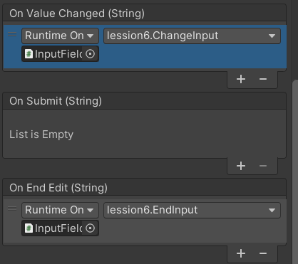 输入框有两个事件函数,一个是改变输入内容时调用的事件函数onValueChanged,一个是结束输入时调用的事件函数onEndEdit。同样也是有两种方式:代码拖拽和事件添加: