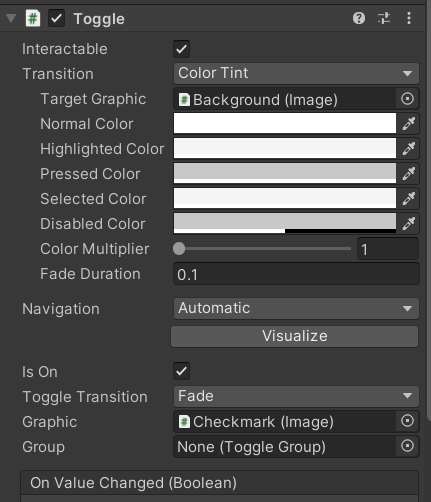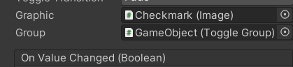 需要注意的是,toggle的事件选择函数必须传入一个bool参数,这个参数代表的就是当前Toggle是否被选中: