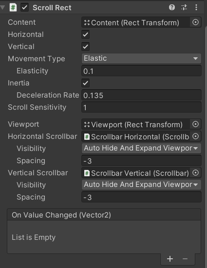 ScrollView的事件函数是onValueChanged,同样有两种使用方式,代码拖曳和直接通过代码添加。需要注意的是,必须传入一个Vector2参数,代表当前滚动区域上滚动的位置。