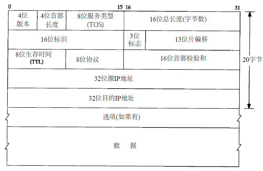 - 8位协议字段:标识上层协议(如TCP=6、UDP=17、ICMP=1),用于数据报交付给对应协议处理。