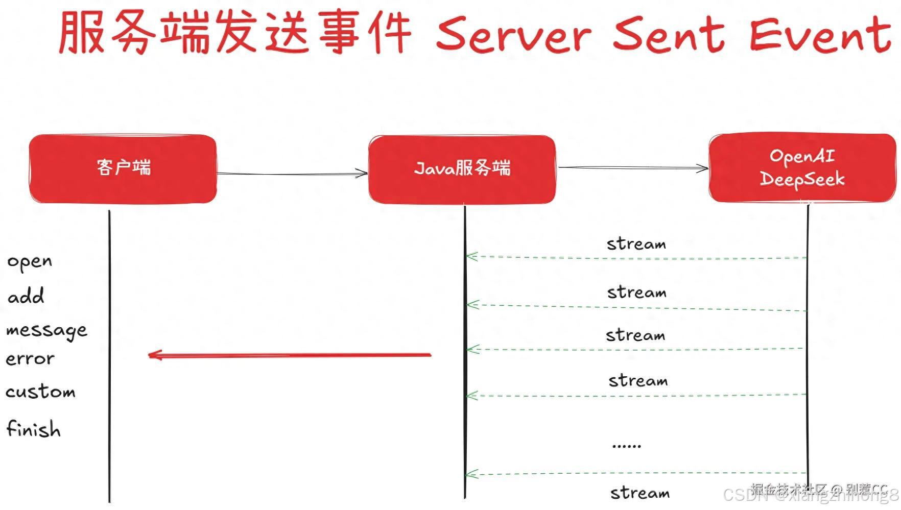 在动手编码之前,我们有必要先花点时间了解一下本次实现的关键技术------SSE ,全称 Server-Sent Events ,即"服务器发送事件"。你可以把它想象成你关注了一个新闻App的"突发新闻"推送。你只需要在App里点击一次"允许通知"(这就是建立连接),之后只要有新的大新闻发生,App服务器就会主动把消息推送到你的手机上,你不用一遍遍地去刷新App。