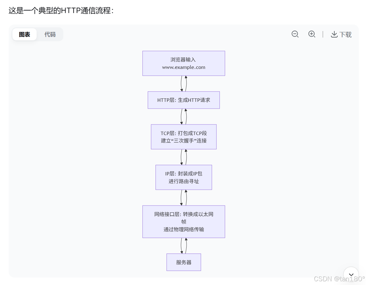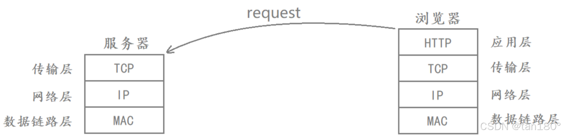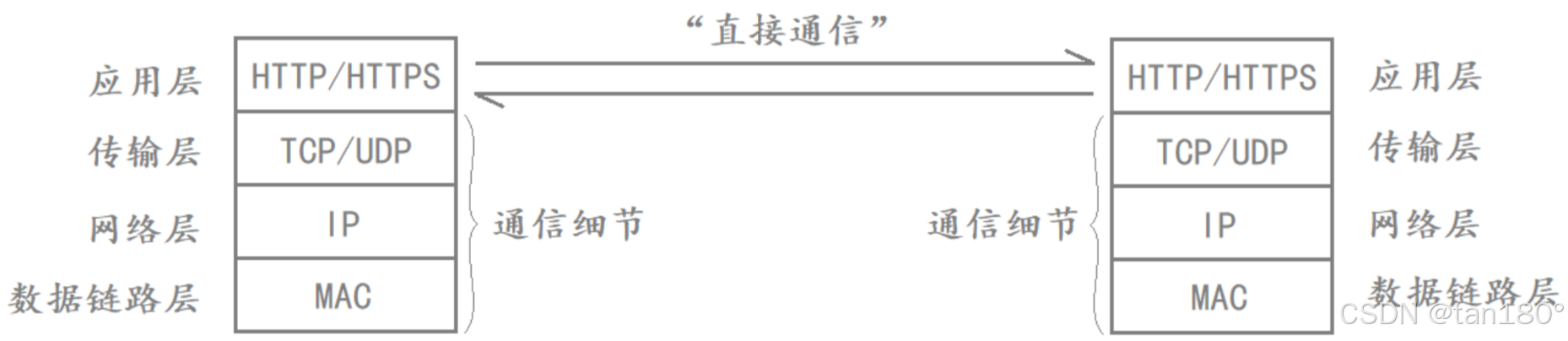应用层常见的协议有 HTTP 和 HTTPS ,传输层常见的协议有 TCP ,网络层常见的协议是 IP ,数据链路层对应就是 MAC 帧了。其中下三层是由操作系统或者驱动帮我们完成的,它们主要负责的是通信细节。如果应用层不考虑下三层,在应用层自己的心目当中,它就可以认为自己是在和对方的应用层在直接进行数据交互