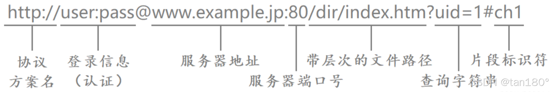 - 登录信息: usr:pass 表示的是登录认证信息,包括登录用户的用户名和密码。虽然登录认证信息可以在 URL 中体现出来,但绝大多数 URL 的这个字段都是被省略的,因为登录信息可以通过其他方案交付给服务器( POST 请求方式,我们后面会讲)