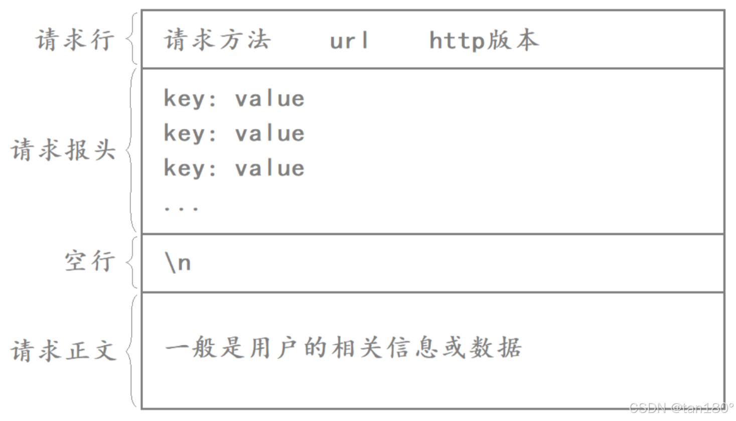 其中,前面三部分是一般是 HTTP 协议自带的,是由 HTTP 协议自行设置的,而请求正文一般是用户的相关信息或数据,如果用户在请求时没有信息要上传给服务器,此时请求正文就为空字符串。
