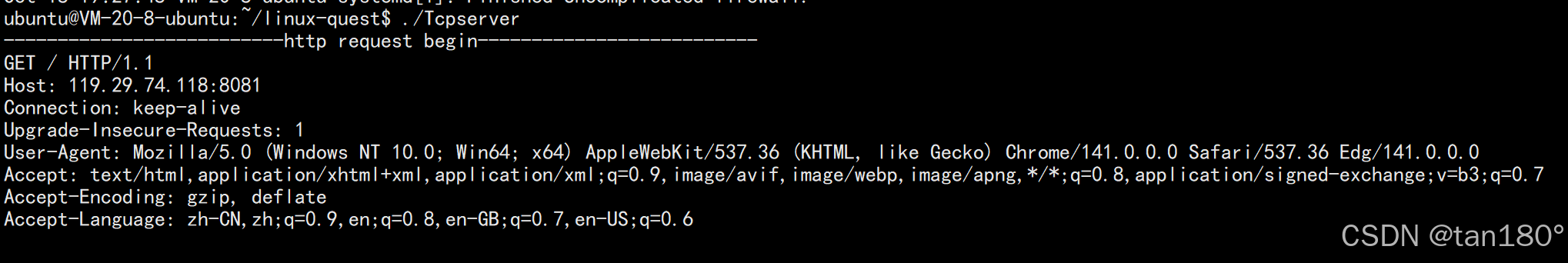 由于我们的服务器是直接用 TCP 套接字读取浏览器发来的 HTTP 请求,此时在服务端没有应用层对这个 HTTP 请求进行过任何解析,因此我们可以直接将浏览器发来的 HTTP 请求进行打印输出,此时就能看到 HTTP 请求的基本构成