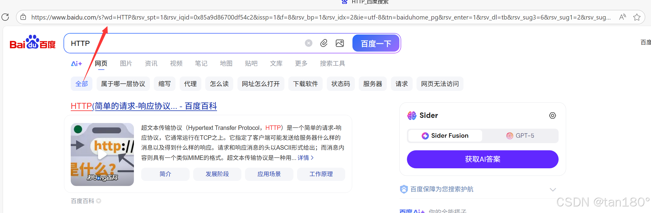 同时我们还会向服务器请求别的资源,如视频、音频而不是只有简简单单的文本,所以 HTTP 才叫做超文本传输协议,另外我们可以看到,这里的路径分隔符是 / ,而不是 \ ,这也就证明了实际很多服务都是部署在 Linux 上的 - 查询字符串 : uid=1 表示的是请求时提供的额外的参数,这些参数是以键值对的形式,通过 & 符号分隔开的,比如说我们现在搜索 HTTP ,我们可以看到 URL 中有很多参数,其中就有一个 wd=HTTP