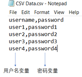 - 变量名称:设置从CSV文件中读取出来的数据需要保存的变量,多个变量之间通过指定的分隔符进行分割,如下图所示的CSV文件中,可以看到其包含了两列数据,因此可以保存成两个变量,一个变量用于存储用户名,比如叫user,一个变量用于存储密码,比如叫password,在后续的Jmeter性能测试脚本中,就可以通过{user}和{password}来引用这两个变量了。
