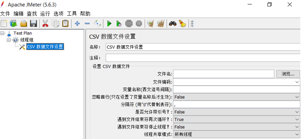 - 文件名:设置需要读取的CSV文件名称,通常建议包含完整的文件路径,当然也可以使用相对路径,相对路径通常是根据当前Jmeter测试计划所保存的路径来进行相对路径的解析,由于Jmeter支持分布式性能压测,当使用分布式性能压测时CSV文件必须存储在服务器主机系统上与JMeter服务器启动位置相对的正确目录中。