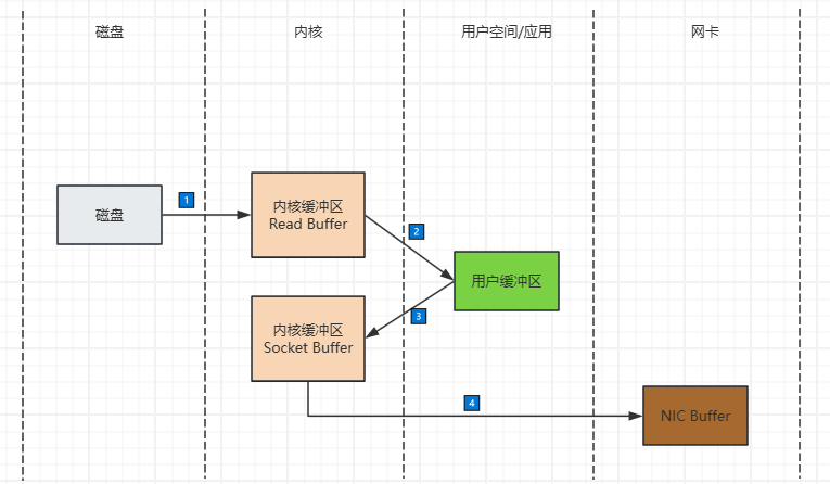 传统拷贝 | 磁盘→内核缓冲区(DMA)→用户缓冲区(CPU)→Socket缓冲区(CPU)→网卡(DMA) | 2次CPU拷贝,2次DMA传输 |