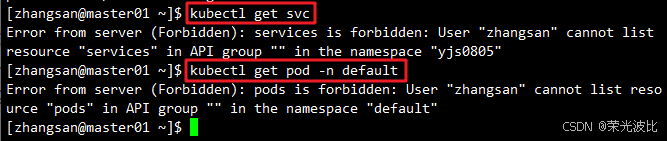 # Error from server (Forbidden): services is forbidden: User "zhangsan" cannot list resource "services" in API group "" in the namespace "yjs0805"
