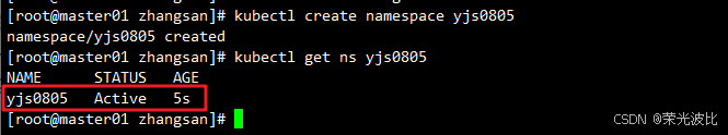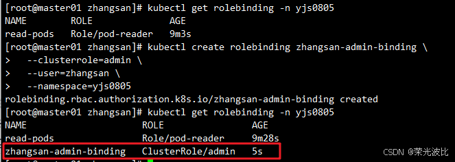 # root用户执行,将admin ClusterRole赋予zhangsan用户(仅作用于yjs0805命名空间)