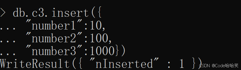 返回结果 WriteResult({ "nInserted" : 1 }) 可以看出,写入成功了。其中 nInserted: 1 表示成功插入了 1 条文档。