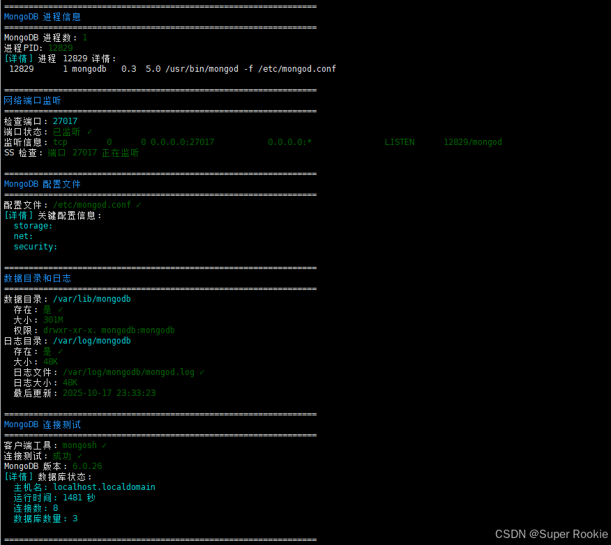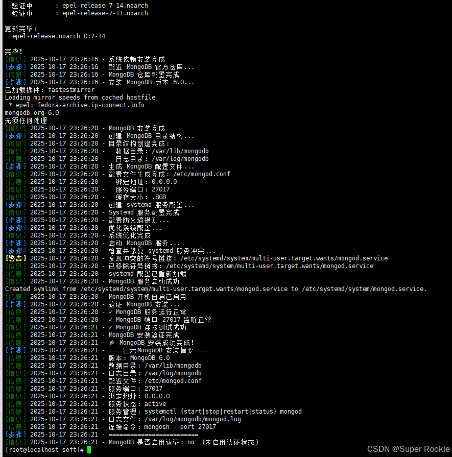 这个脚本提供了完整的MongoDB安装方案,包括安全配置、性能优化集支持,适合生产环境使用!