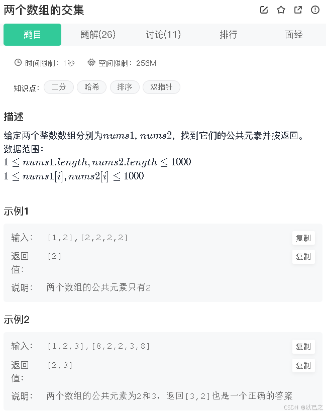题目的意思很简单,就是求两个数组的交集,和求链表的共同数据基本相同