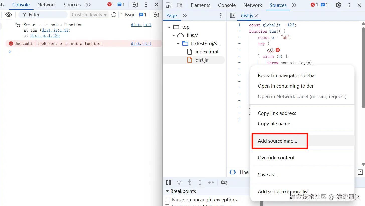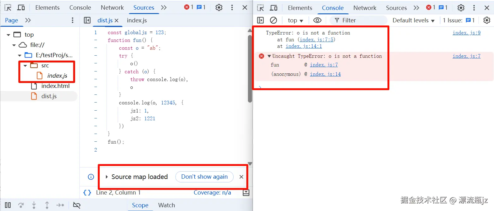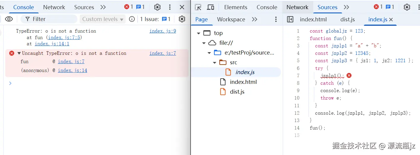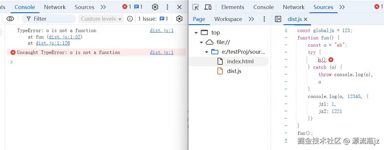 上一节的示例代码中故意留了一个错误,而且为了输出栈,先捕捉异常再进行抛出。这里以上一节中使用Terser生成的代码为例,描述在Chrome浏览器中如何使用SourceMap。