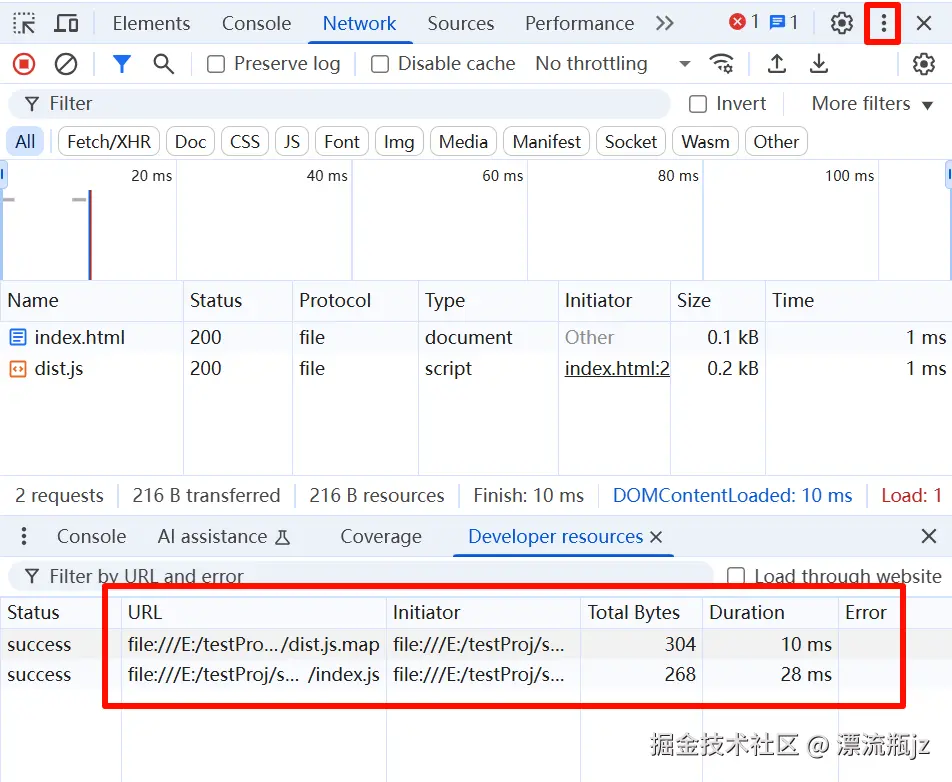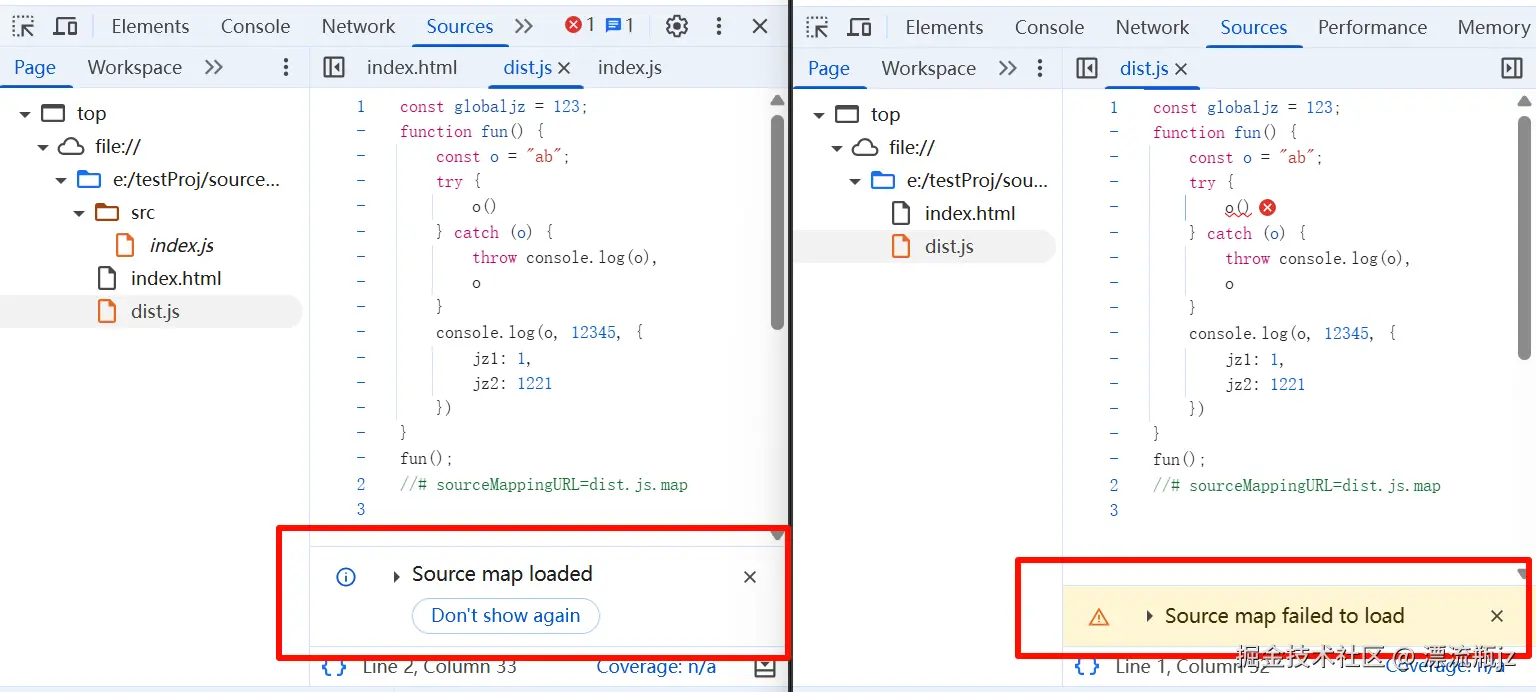 - 第二个SourceMap的源代码是 dist1.js 2行2列;生成代码是 dist2.js 3行3列