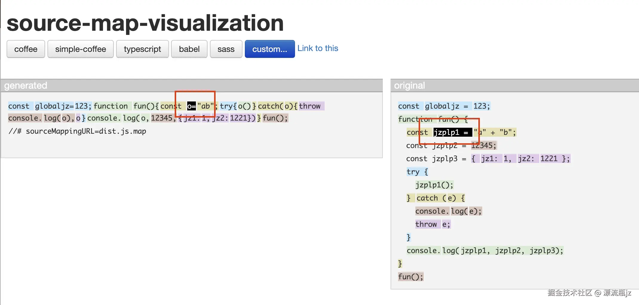 source-map-visualization是一个可视化查看SourceMap代码位置关系的应用,网络上提供了很多在线工具可供使用(参考链接有描述)。上传源文件,生成文件和SourceMap文件,即可查看位置关系。例如这样上传文件: