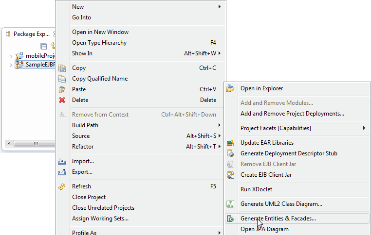 要生成实体,请在Package Explorer视图中右键单击项目,并选择MyEclipse>Generate Entities & Facades,这将启动EJB3逆向工程向导。