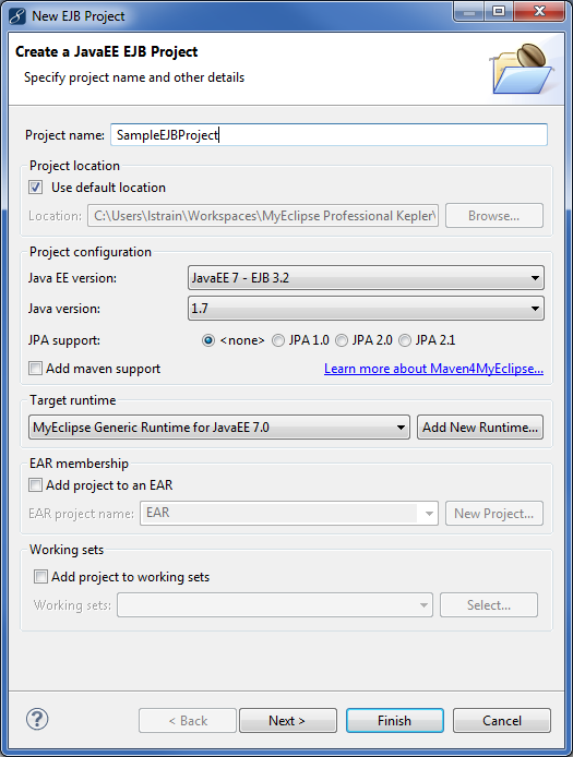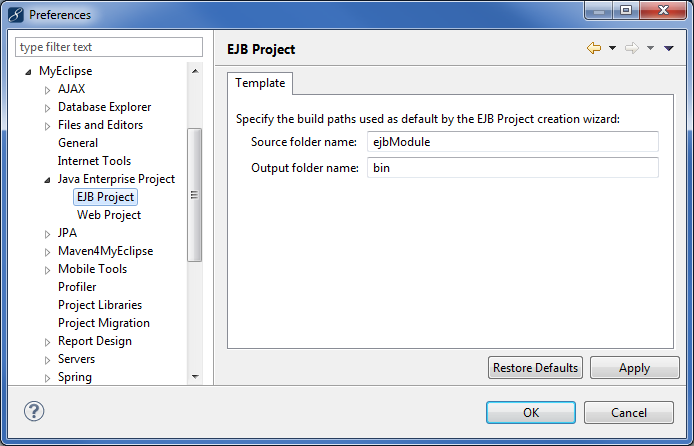 要访问MyEclipse参数,请选择 Window>Preferences,展开MyEclipse>Java Enterprise Project,然后选择EJB Project。