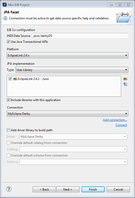 如果您包含持久性支持,JPA Facet页面允许指定运行时JNDI数据源并选择MyEclipse数据库驱动程序和模式。您的项目必须包含JPA Facet,以便从数据库中对实体进行逆向工程。如果您在创建项目时没有添加持久性支持,可以通过右键单击项目并选择MyEclipse> project Facets>Install JPA facet来添加JPA facet。