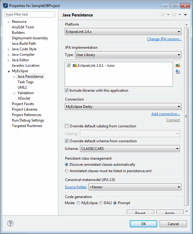 您可以随时使用Java Persistence属性页更改EJB 3项目的设计时驱动程序关联,要打开该页,右键单击项目,并选择Properties。展开MyEclipse,并选择Java Persistence。