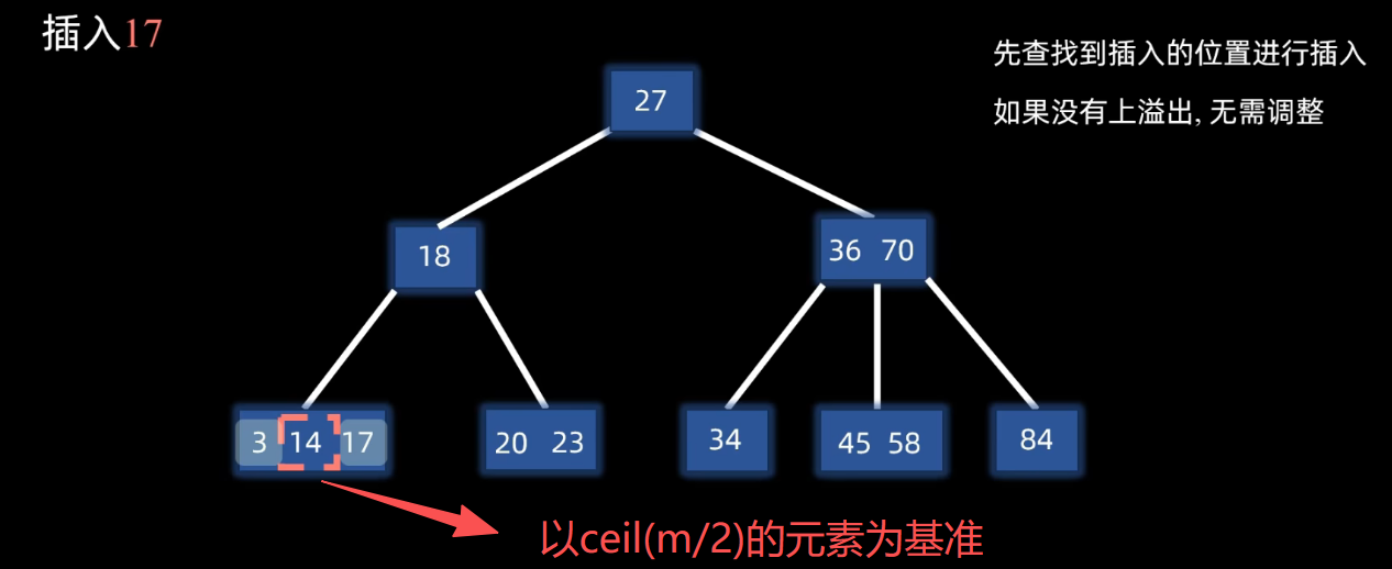 上溢出调整:上溢出节点以ceil(m / 2)元素为基准,将节点的数据划分成三个部分,然后做分裂操作:ceil(m/2)元素上移到父节点,另外两部分数据分裂成两个节点并链接。