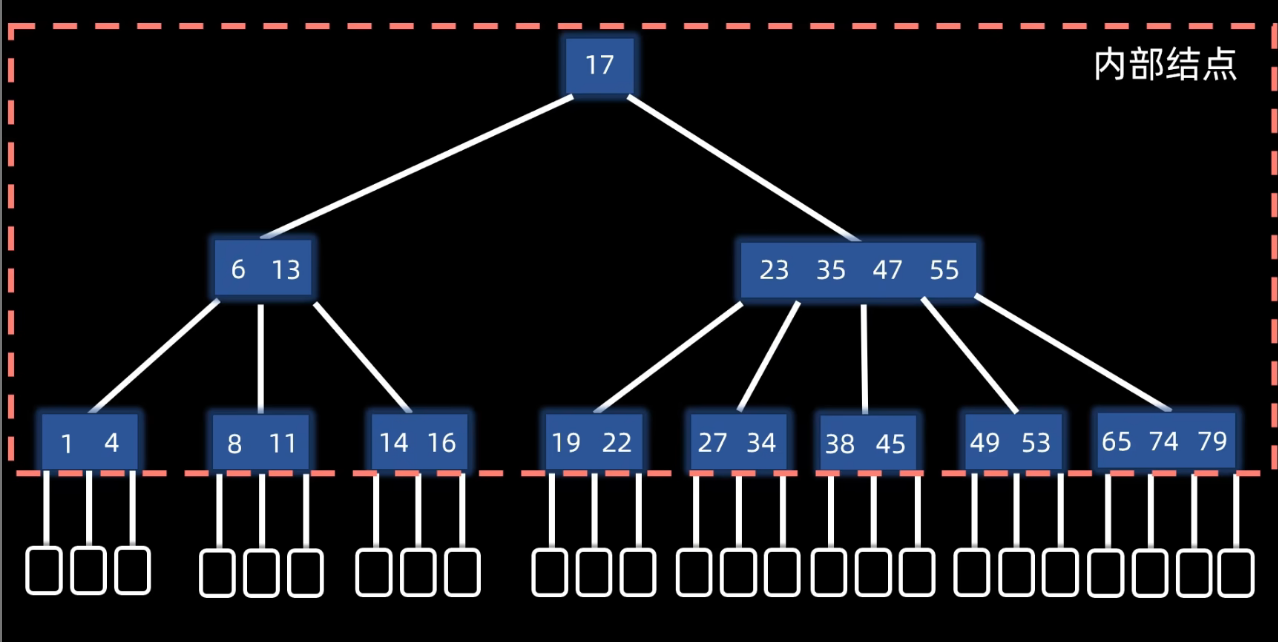 - 其他节点:ceil(m / 2)个分支,ceil(m / 2) - 1个元素。