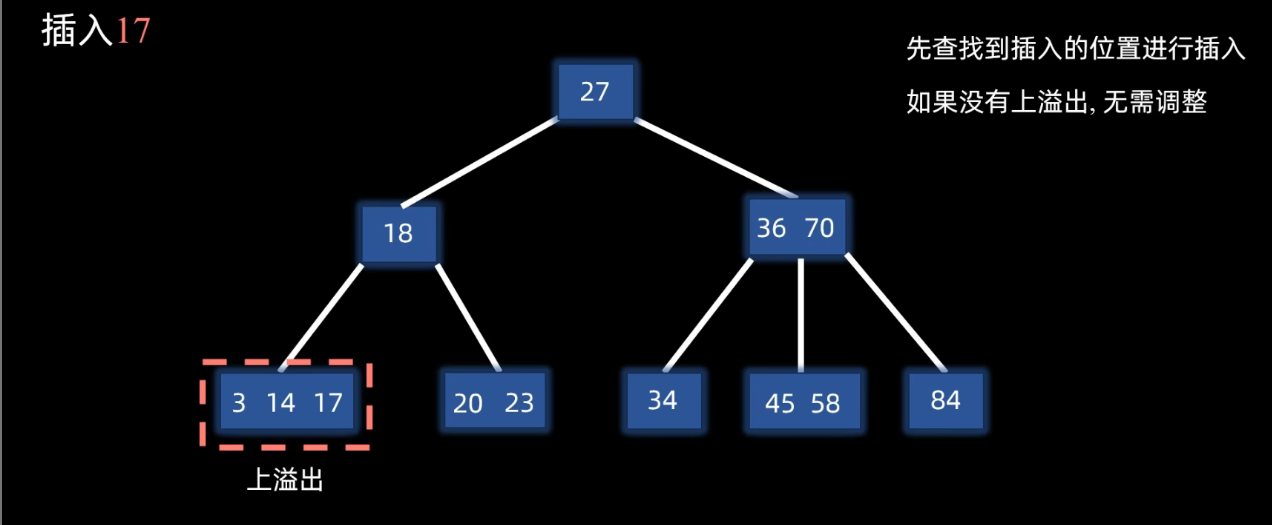 如果根节点也上溢出:继续进行上溢出操作,上移动的数据成为节点作为新的根节点,最终树高多了一层。