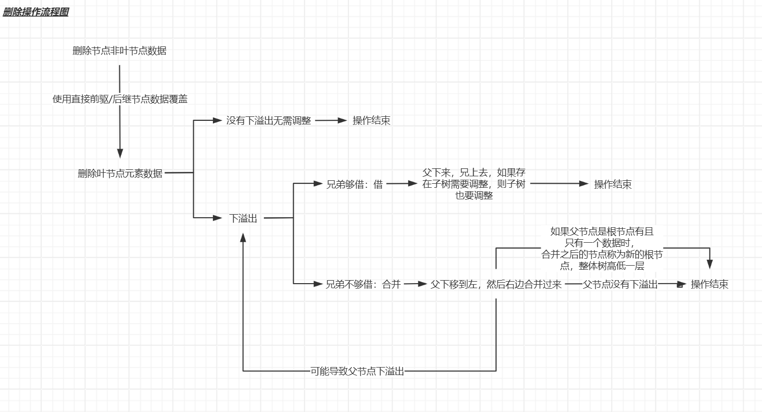 删除叶子节点:直接删除,如果出现下溢出(删除后节点元素数量少于ceil(m/2) - 1)则需要进行下溢出调整操作;否则无需调整。