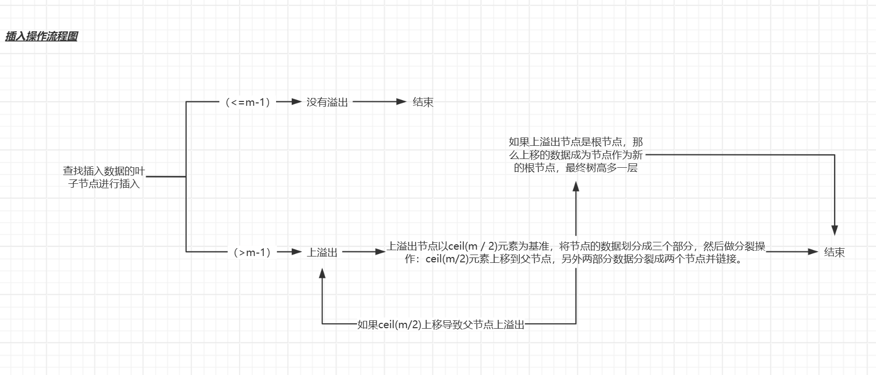 如果插入到父节点之后:父节点也溢出,按同样的上溢出操作继续调整,直到不发生溢出。