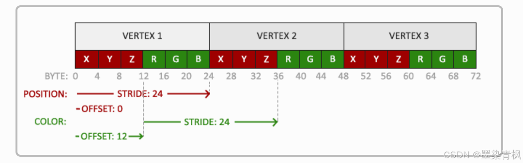 分量)我们必须向右移动6个float,其中3个是位置值,另外3个是颜色值。这使我们的步长值为6乘以float的字节数(=24字节)。