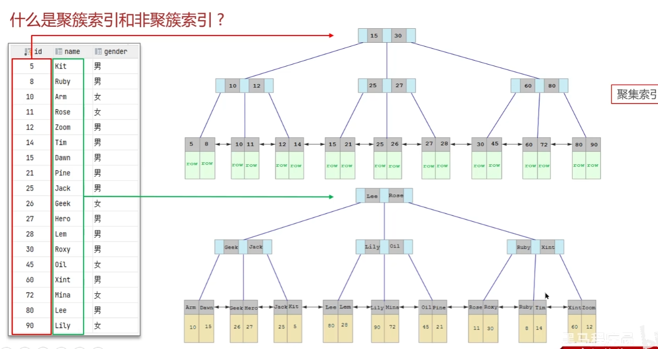 - 聚簇索引:每个表都有,且只有一个,表数据按照索引键的顺序存储,索引的叶子节点就是数据页本身,一般为主键索引