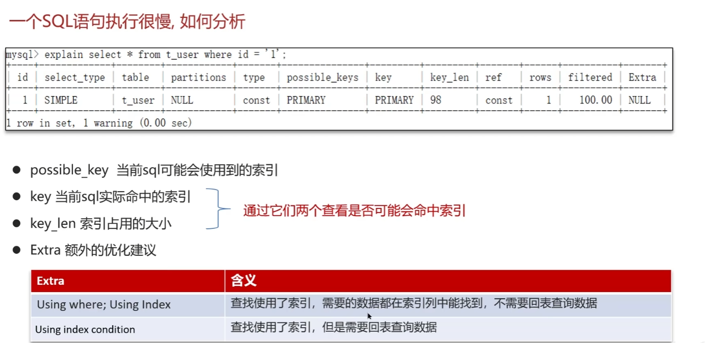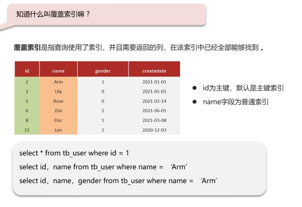 - 查询用到了索引,且返回的数据在该索引中都存在,如果返回的列中有没有创建索引的数据,则会进行回表查询