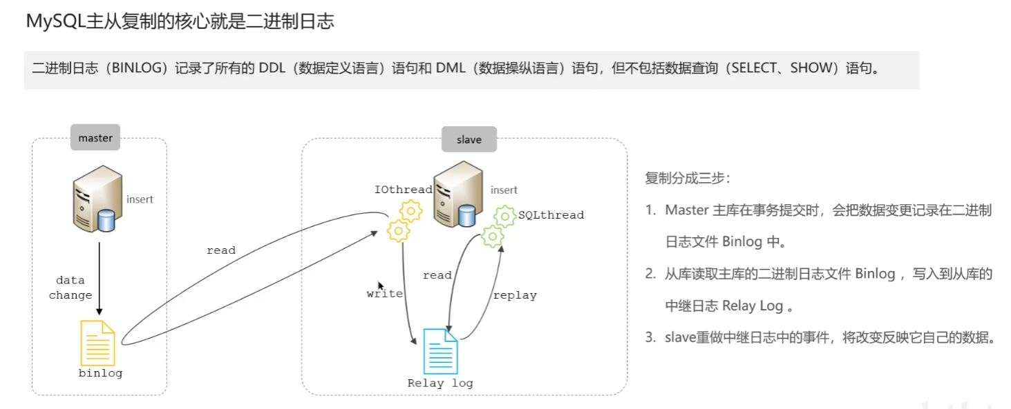 - Master主库在事务提交时,会将变更记录在binglog(二进制日志文件)中。