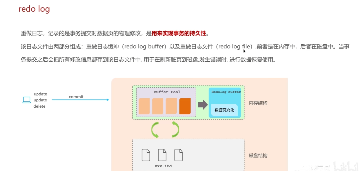 - 重做日志,用来记录事务提交时数据页物理的修改,用来实现事务的持久性