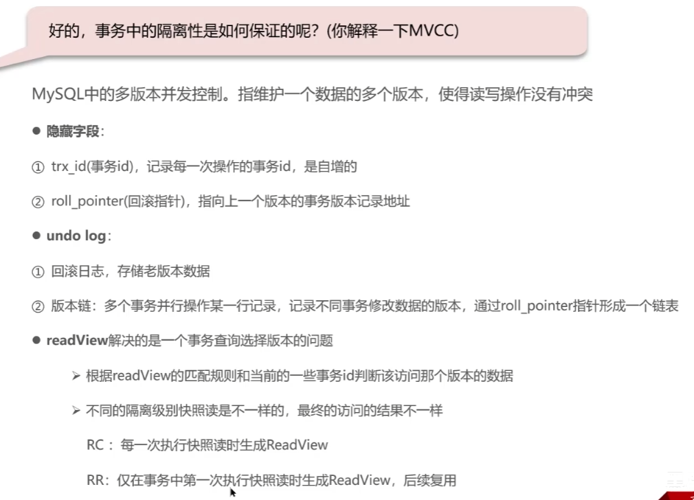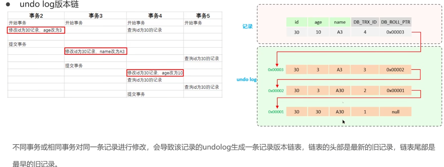 - 回滚指针:指向这条记录的上一个版本,用于配合undo log ,实现了一条记录的一个版本链