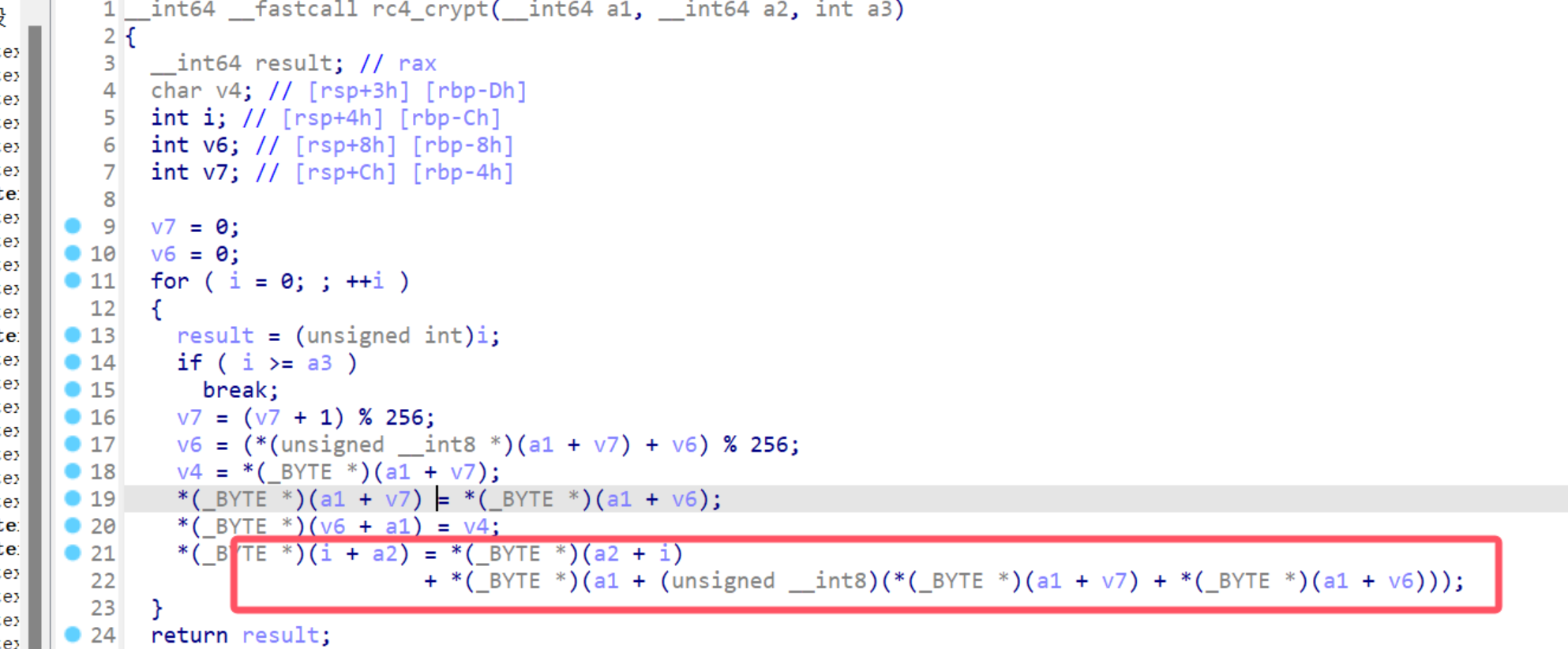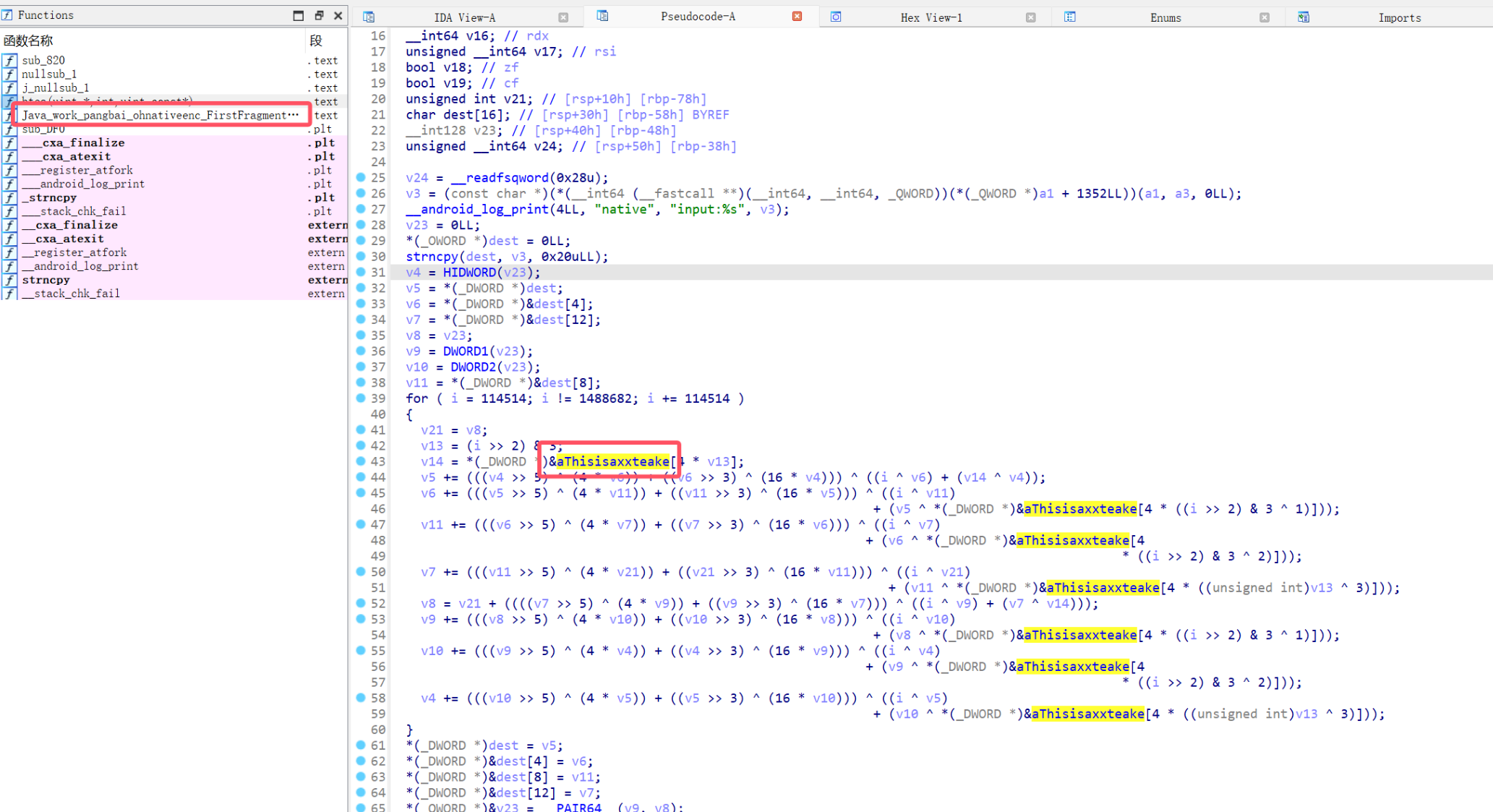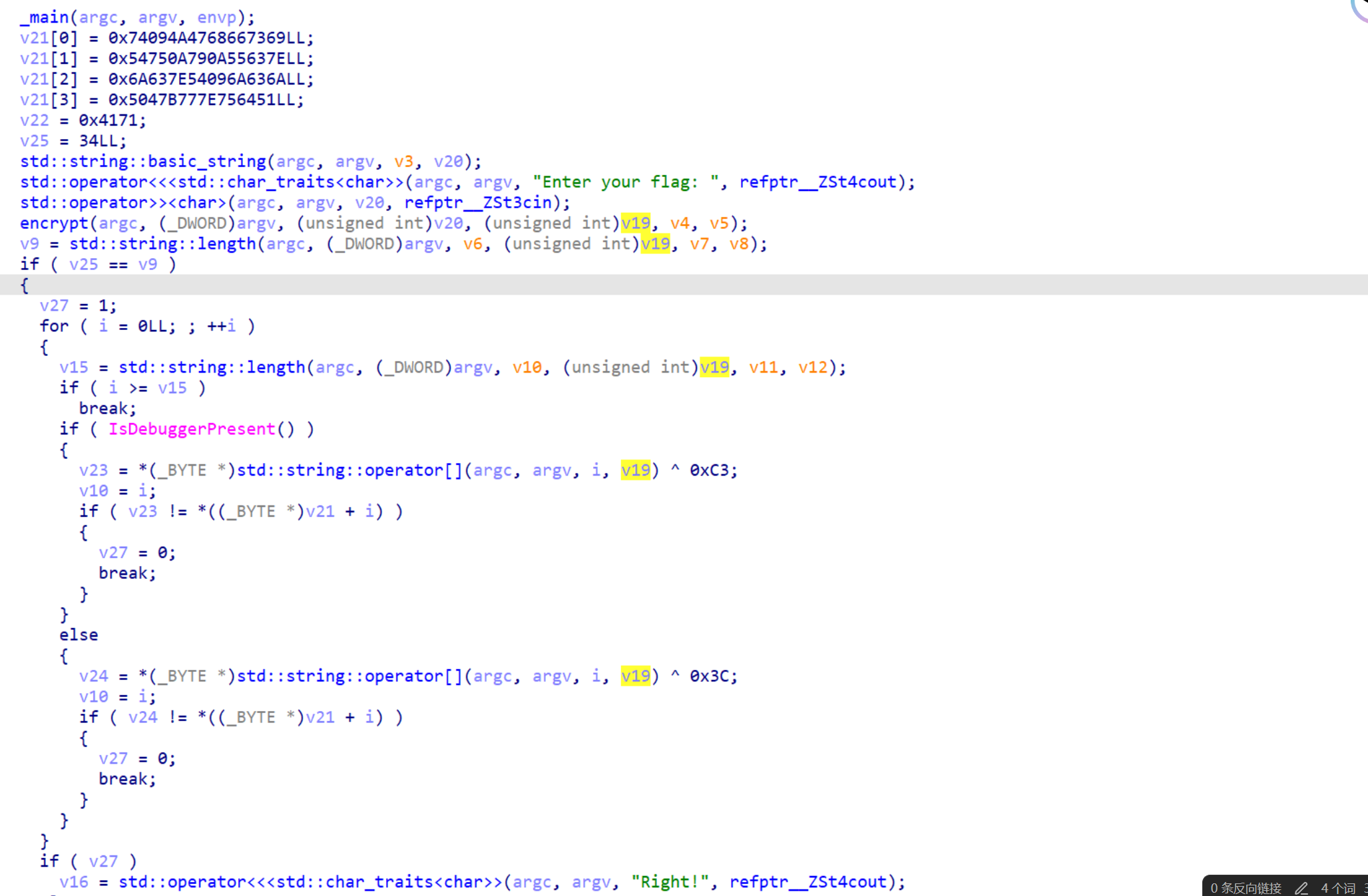 主要逻辑如下,其中v19是我们的输入,v21是密文,长度为34