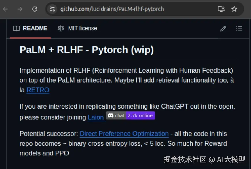这个仓库提供了在谷歌 PaLM 架构上应用人类反馈强化学习(RLHF)的开源实现。这个项目旨在复制 ChatGPT 的功能,对于那些对理解和开发基于 RLHF 的应用感兴趣的人来说非常有帮助。
