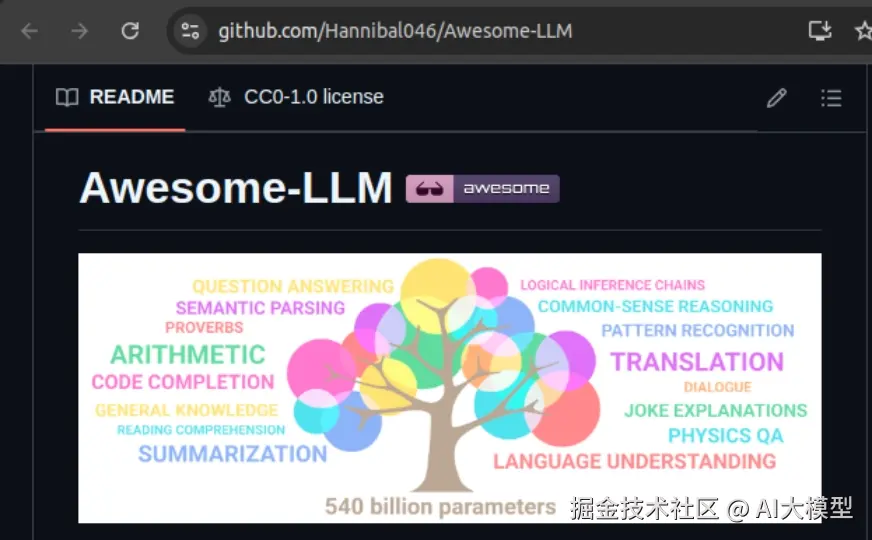 这是一个关于 LLM 的"资源宝库",涵盖了从开创性研究论文、训练框架、部署工具到评估基准等各类资源。它按照不同的类别组织,包括论文和应用书籍,并且还设有排行榜来跟踪不同 LLM 的性能。
