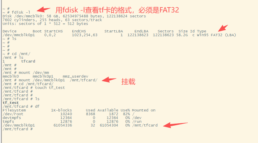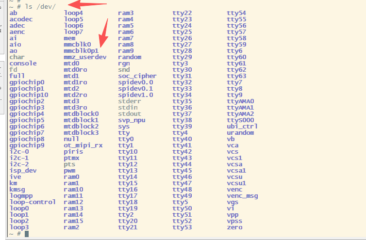 其中/dev目录下的mmcblk0p1为linux挂载TF卡的节点