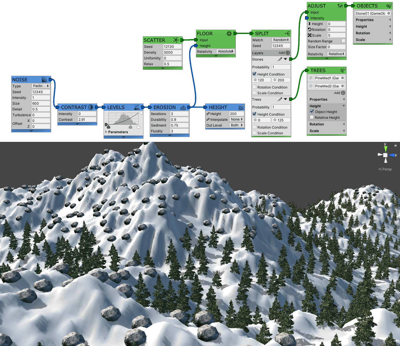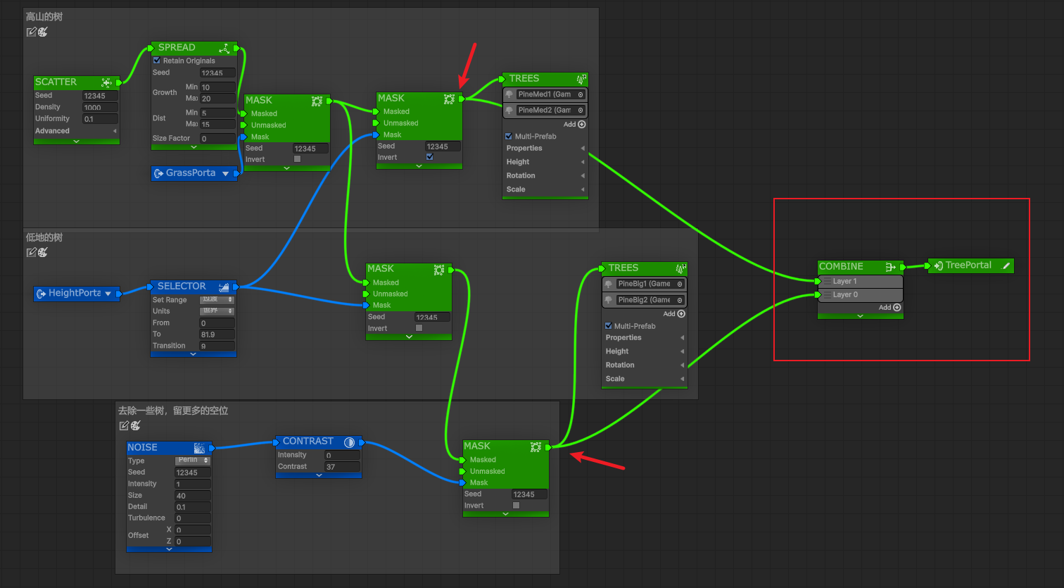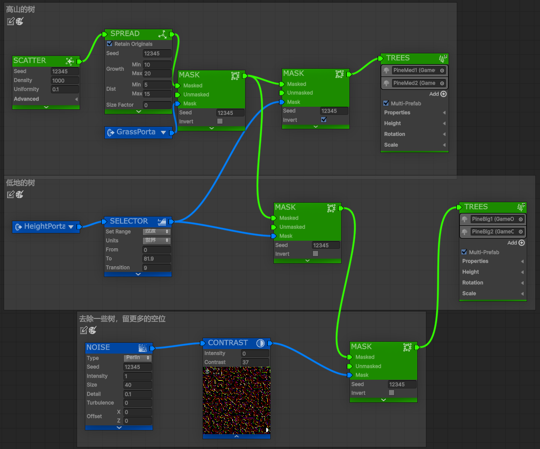 根据对象的高度分割散布的对象:如果对象的高度在 0-125 之间,则输出为松树;如果高度在 120-200 之间,则输出为石头。如果对象的高度在 120-125 之间,则可能随机输出为树或石头