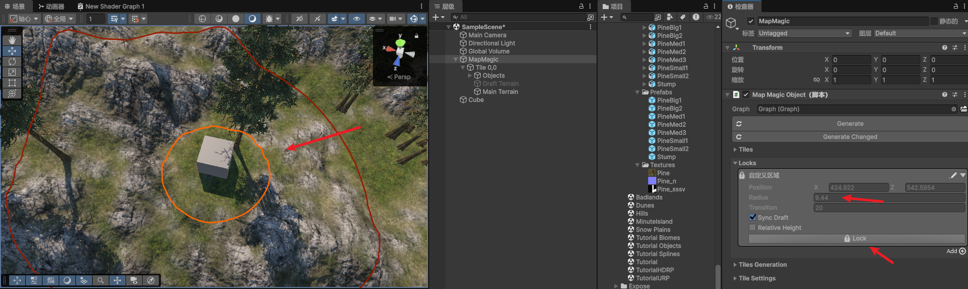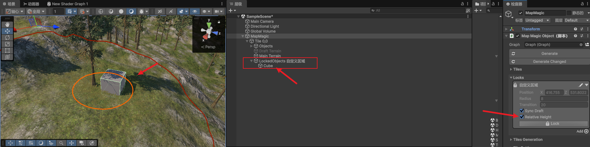 然后我们在MapMagic上添加一个LOCKS锁定区域,覆盖我们前面修改的自定义区域