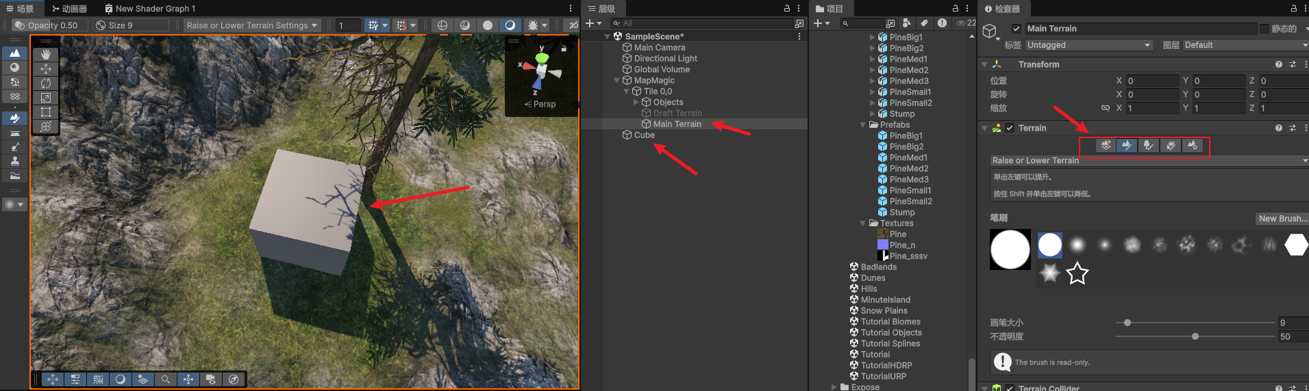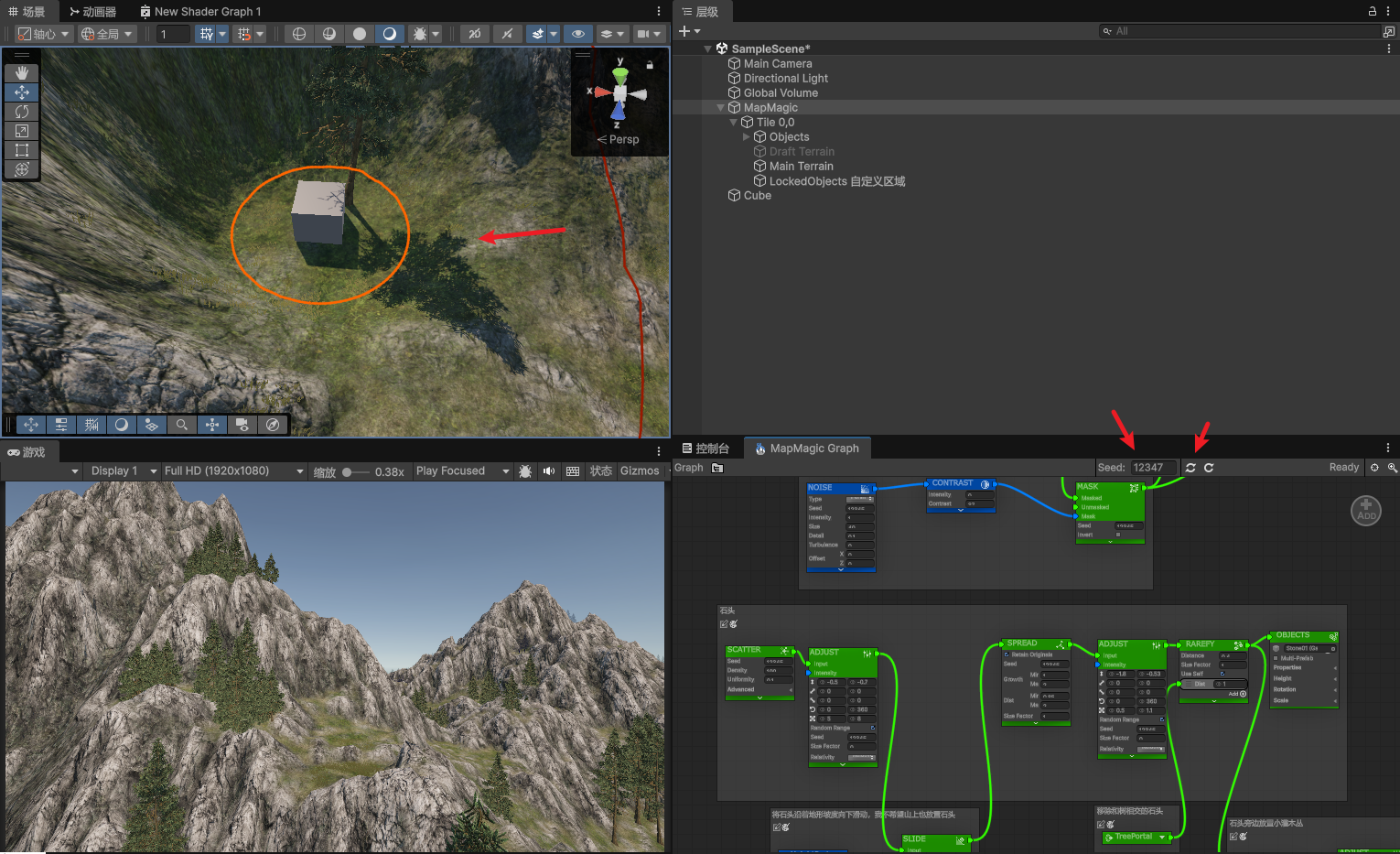 我们可以在生成的地形上放置自定义的物品,比如村庄,甚至还可以通过Terrain地形工具某个区域的修改地形样式